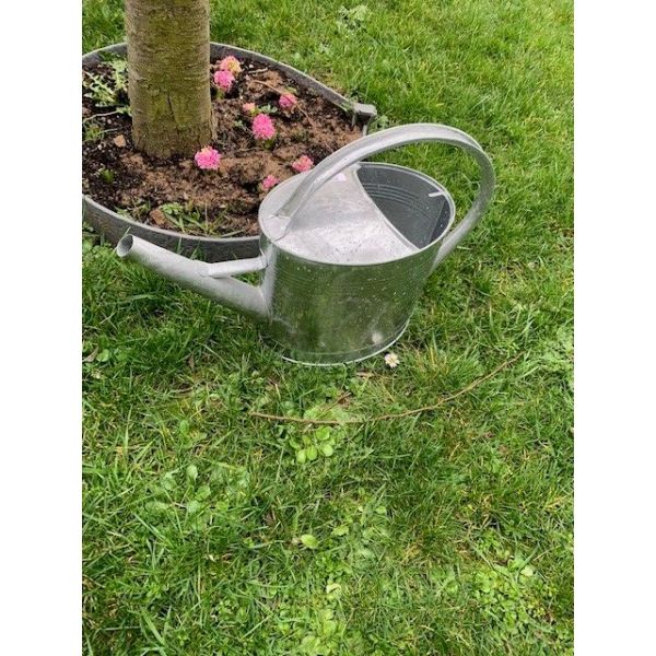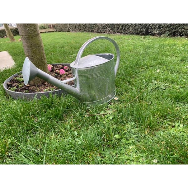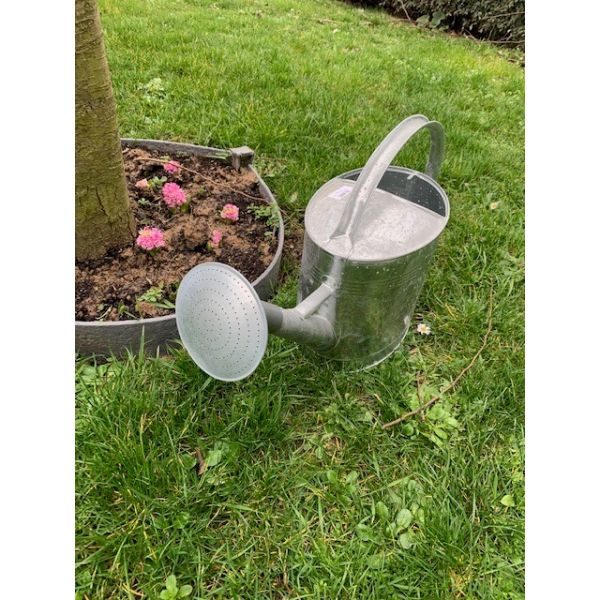 Acier galvanisé, forme ovale, capacité 13 L, pomme amovible avec trous de 1,5 mm, anse creuse.