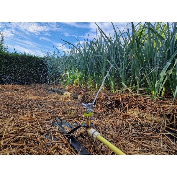 Facile à déplacer sans piétiner la zone arrosée. Tête d’arrosage réglable sur 90, 180, 270 ou 360° et en profondeur pour une portée jusqu’à 14,5 m.