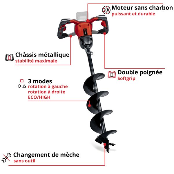 La tarière sans fil est vendue avec une mèche de forage (longueur 80 cm, diamètre 15 cm).