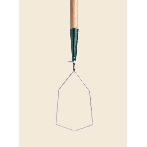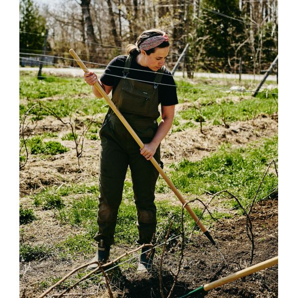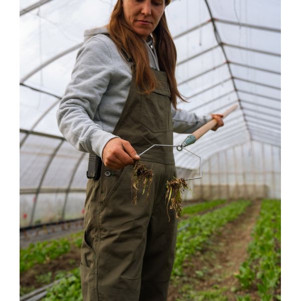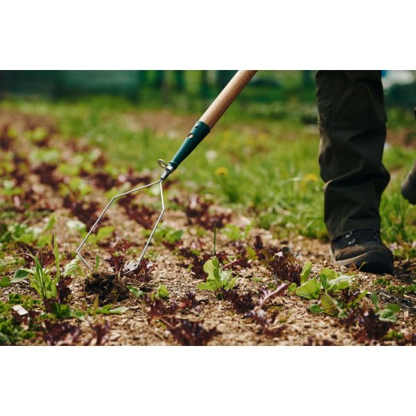 Grâce à son long manche, le cultivateur peut garder en tout temps son dos bien droit lorsqu’il doit enlever des mauvaises herbes.