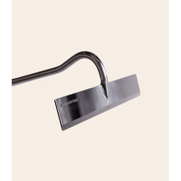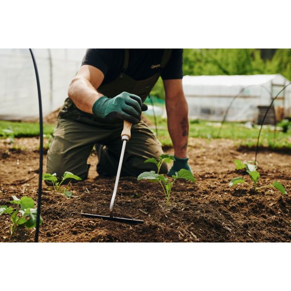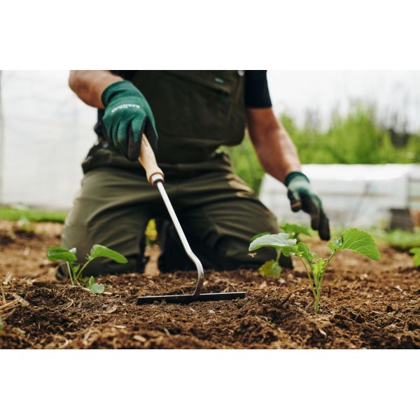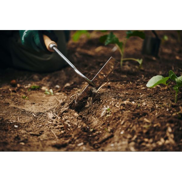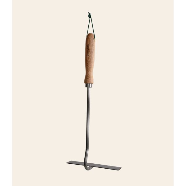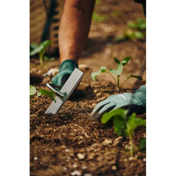 Équipé d'une lame tranchante de 18 cm, il coupe les mauvaises herbes au plus près des plantes, au niveau de leurs racines.