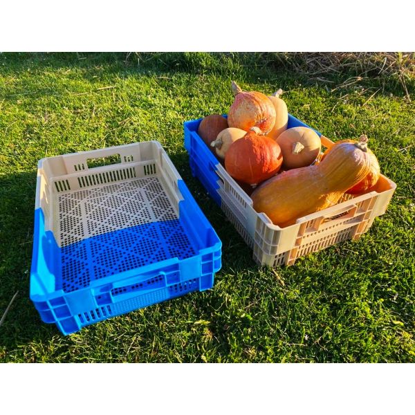 Caisse polyéthylène haute densité à fond et parois ajourées, bicolore bleu et beige, 4 poignées.