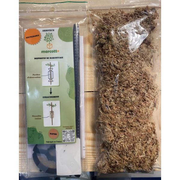 Le kit contient: 1 manchon, 2 colliers, 2 disques, 1 pack de sphaigne (substrat), 1 notice de montage et 1 guide de marcottage.