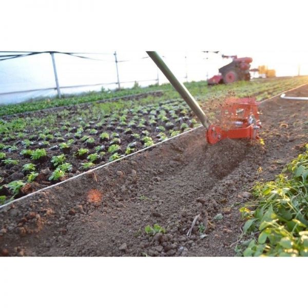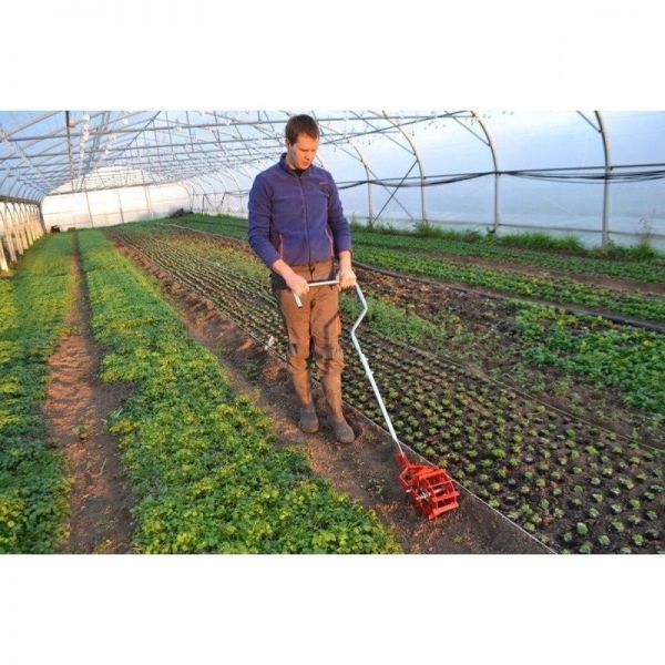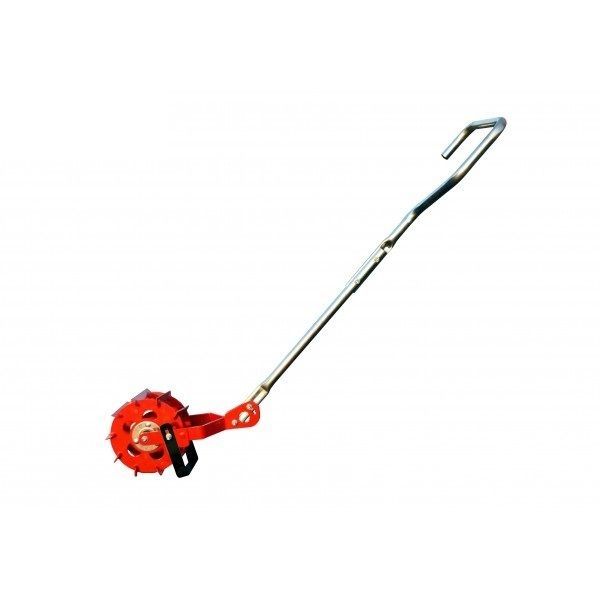 Cet outil se compose d'une roue et d'une lame de sarclage située en position arrière. La roue, montée sur roulement, permet de plaquer les herbes indésirables tandis que la lame les coupent nettement en dessous de la surface du sol.