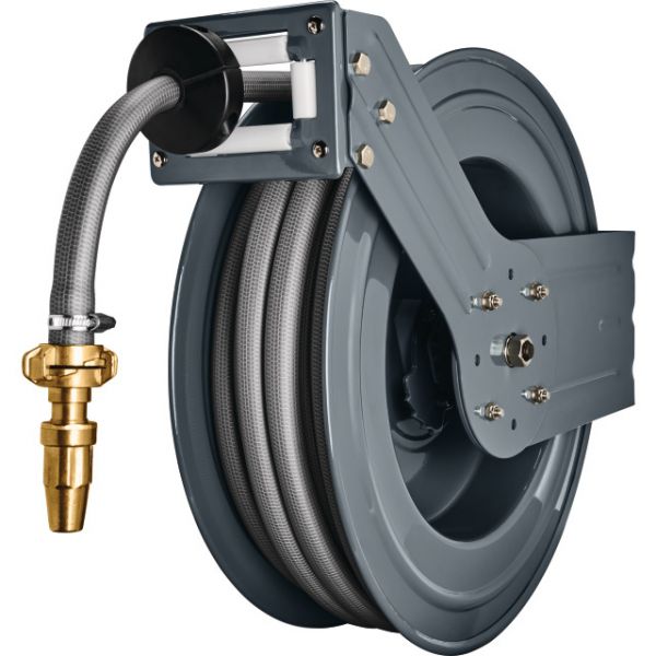 Dévidoir mural en acier poudré robuste. Enroulement automatique du tuyau avec guidage doux, blocage graduel même à distance en tirant sur le bout du tuyau.