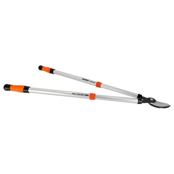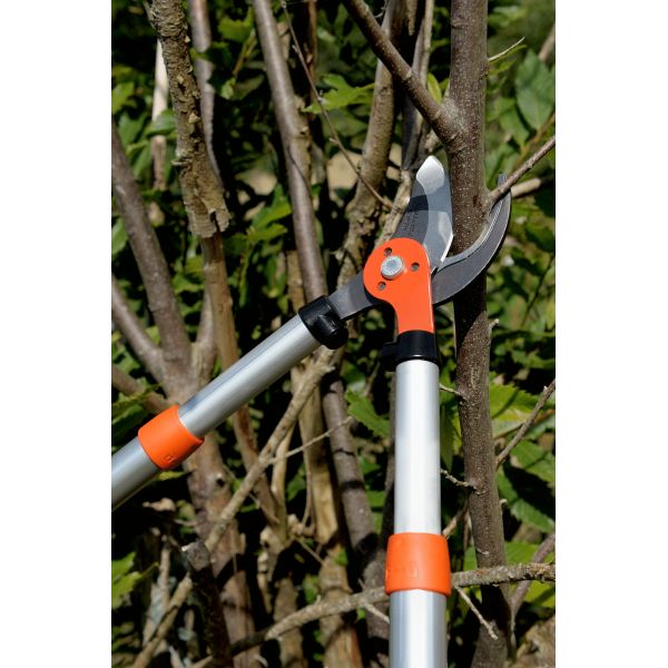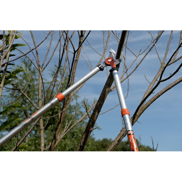 Ebrancheur télescopique à manches en tubes d'aluminium argenté, extensibles de 70 à 90 cm et lames croisantes.
