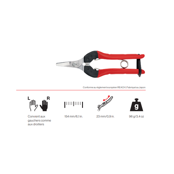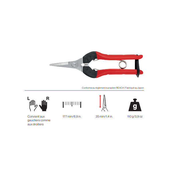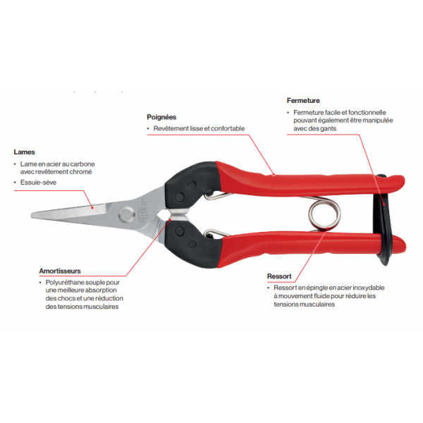 Compactes, légères et ergonomiques, les épinettes FELCO sont particulièrement résistantes et durables grâce à leurs poignées en acier, tandis que leurs amortisseurs en polyuréthane souple garantissent un confort maximal et réduisent les tensions musculaires.