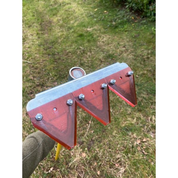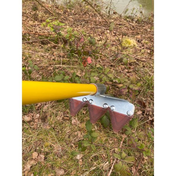 Les lames tranchantes (interchangeables) sont dentées, revêtues d’un traitement anticorrosion et boulonné pour permettre leur aiguisage ou leur changement. Largeur de travail 23 cm – Manche de 143 cm.