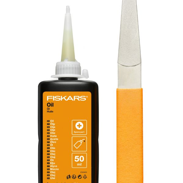 Le kit d'entretien Fiskars et composé d'un flacon d'huile de 50ml, une lime diamant, ainsi qu'un guide d'entretien
