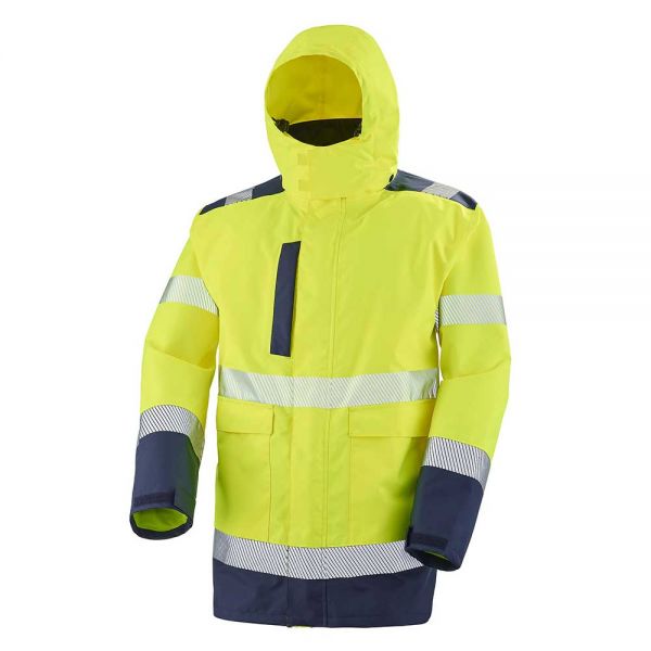 De style moderne avec ses bandes segmentées, elle se veut également très fonctionnelle avec plus de 6 poches dont une poche napoléon et une capuche ajustable en hauteur fixée par 3 pressions compatibles avec la doublure.