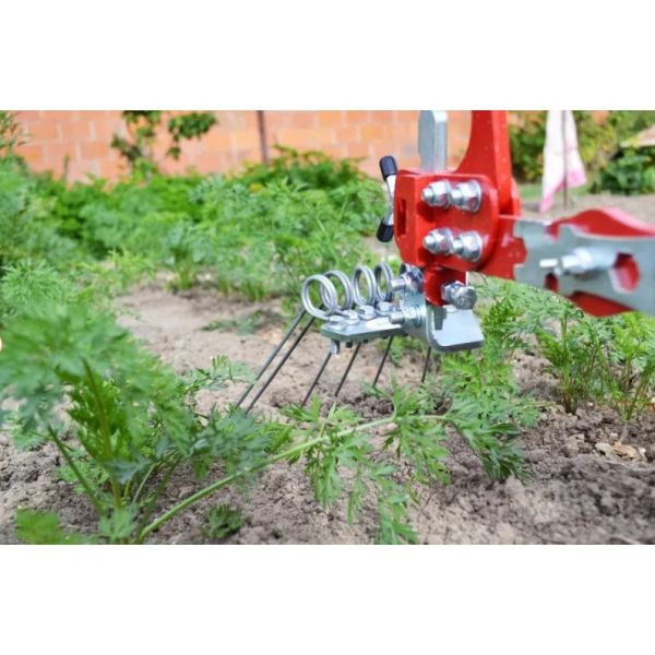 Il est possible de fixer 7 ressorts par support. Chaque dents sont vissées séparément. Ainsi, il est possible de retirer une dent au milieu pour adapter la herse étrille sur la houe double.