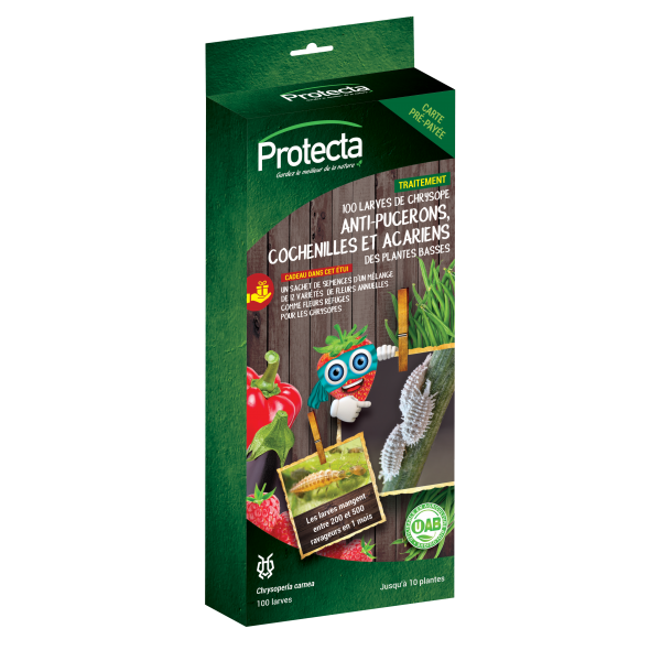 Livrée au stade larvaire, elle se nourrit des oeufs, des larves et des adultes sur les plantes basses. Les larves mangent entre 200 et 500 ravageurs durant leur vie larvaire qui dure 1 mois. Les larves de chrysope présentent une solution idéale pour un traitement de fond avant d’intégrer les coccinelles ou d’autres auxiliaires de jardin plus spécifiques.