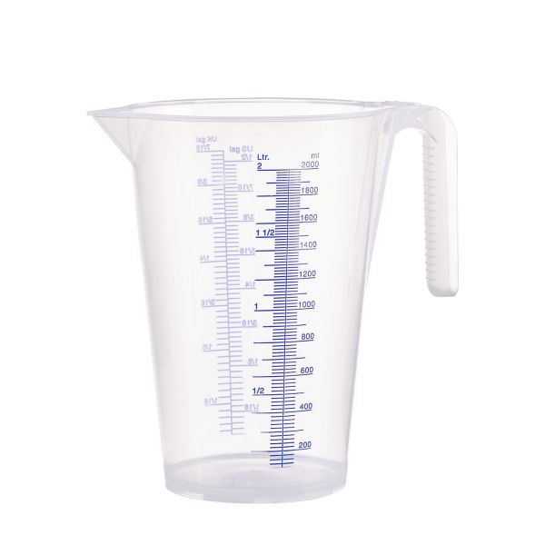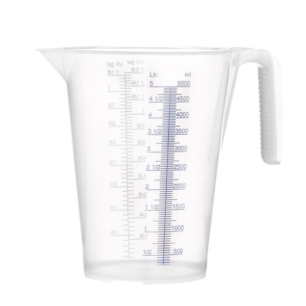 Echelle en relief imprimée en bleu : première échelle par pas de 5 ml, deuxième échelle à 1/16 US gallons et à 7/128 UK gallons.