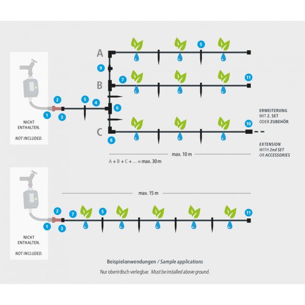 Ce kit a été conçu pour l'arrosage de petites plates-bandes contenant des plantes utiles ou ornementales fragiles.