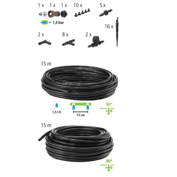 Le deuxième tuyau ultra flexible, de 15 m également, est équipé de goutteurs tous les 15 cm, délivrant une quantité constante de 1,5 l/h.