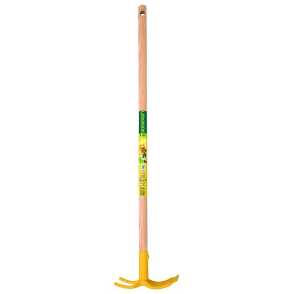 Serfouette en plastique renforcé avec panne et fourche, certifié CE, manche bois PEFC 70 cm. Idéal pour enfants de 3 à 7 ans.