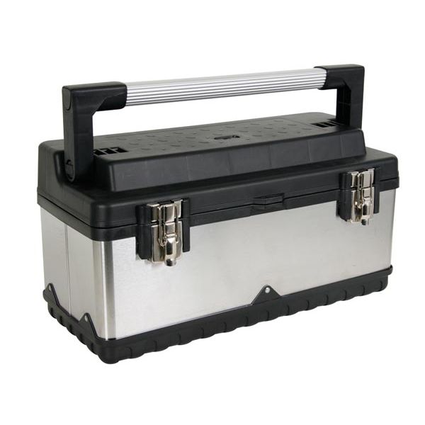 Boîte à outils en acier inoxydable et en polypropylène avec poignée en aluminium pliable.