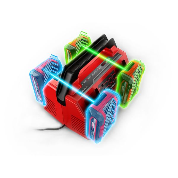 Une fois que deux batteries (1 de chaque côté) sont entièrement chargées, le chargement des deux suivantes démarre automatiquement.
