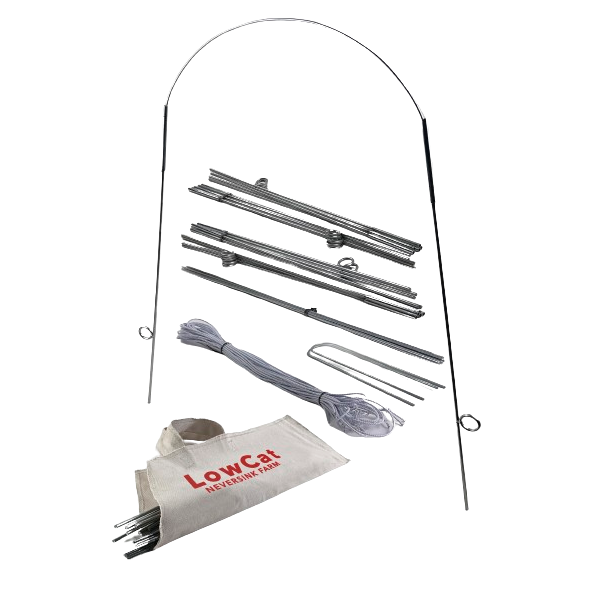 Kit contenant 11 arceaux en acier au carbone inoxydable avec une corde de fixation auto-serrant pour tenir le couverture en place, deux pieux d'ancrage pour chaque extrémité et un sac de portage avec une capacité de 30 arceaux. Longueur 213 à 244 cm, écart de 1,5 à 3 m entre les arceaux.