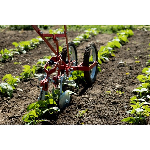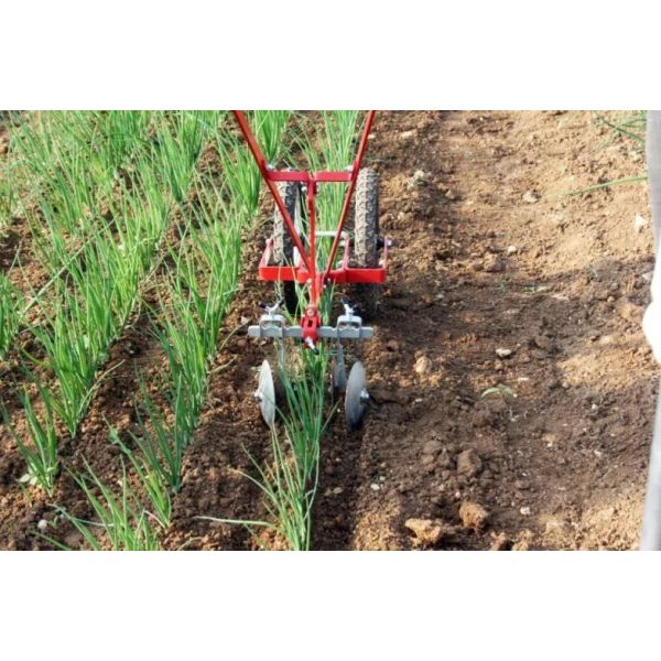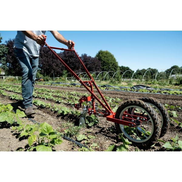 Il s'installe sur une houe maraîchère double et possède deux positions : l'une pour chasser le rang de légumes, l'autre pour désherber (en déchaussant) avec précision.