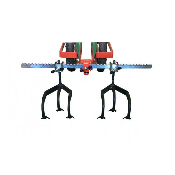 A l'aide de ce support, la houe peut ainsi travailler plusieurs rangs en un seul passage avec le buttoir, griffe trois dents, herse étrille etc.