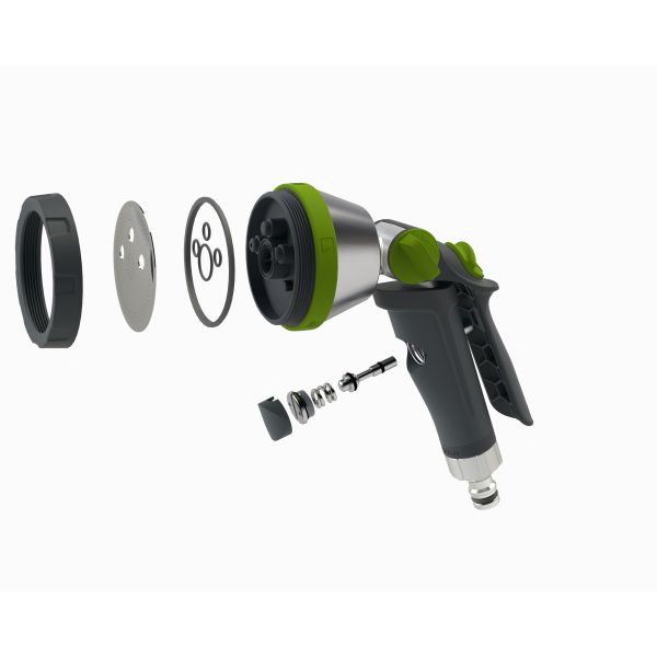 Modèle 5S: 1 jet "douchette", 1 jet "plein", 1 jet "plat" + 1 jet "douchette étroite" adapté à l'arrosage de parterres et bacs à plantes étroits et 1 jet "pulvérisation" pour l'arrosage des semis délicats et sensibles.