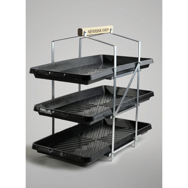Agrandir Porte bacs avec poignée bois, trois niveaux adapté pour les bacs micro et jeunes pousses pour paperpot et autres bacs de 30 cm de large.