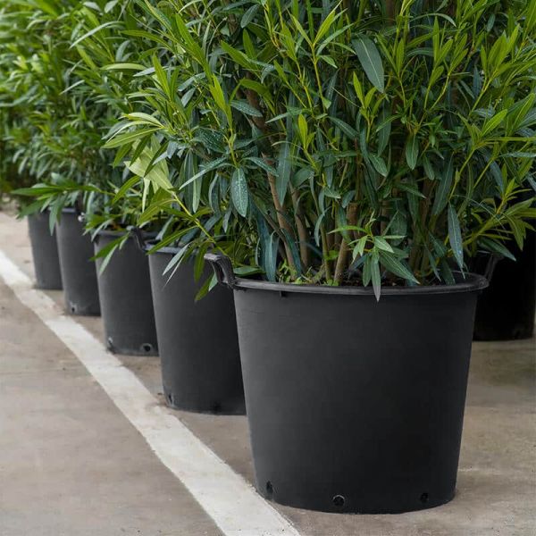 Conteneur de pépinières, en polyéthylène noir régénéré, dotés de poignées latérales pour faciliter leur manipulation.