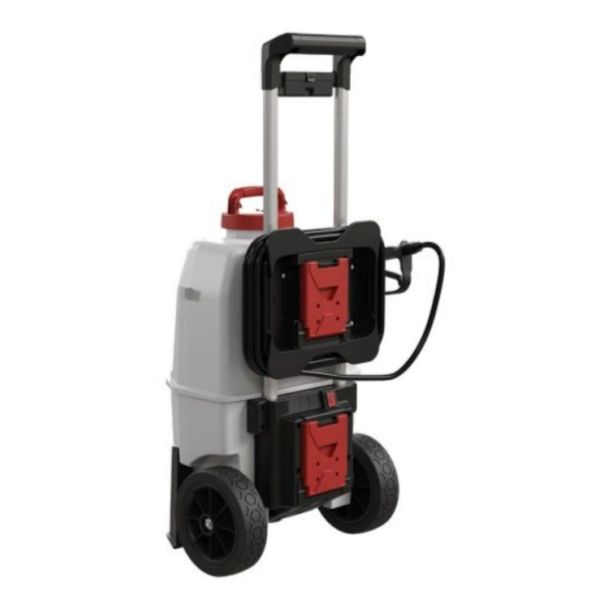 Ce pulvérisateur à usage industriel d'une capacité de 35 litres est doté de deux roues et d'une poignée rabattable pour faciliter le transport.