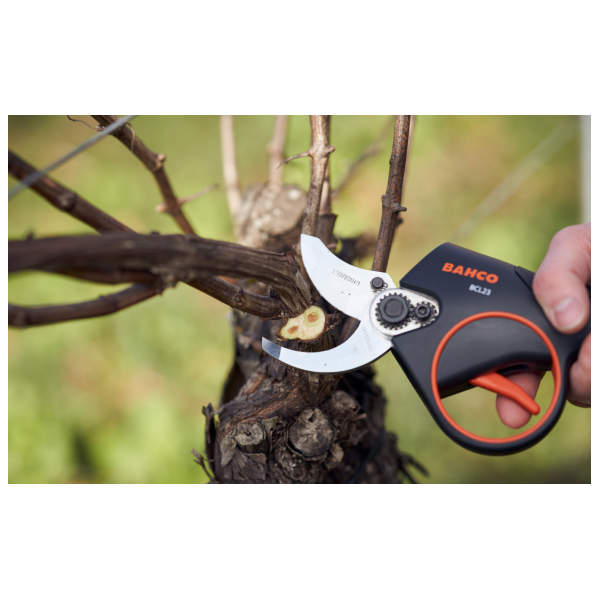 Sécateur électrique à crémaillère, idéal pour la taille intensive et puissante de la vigne.