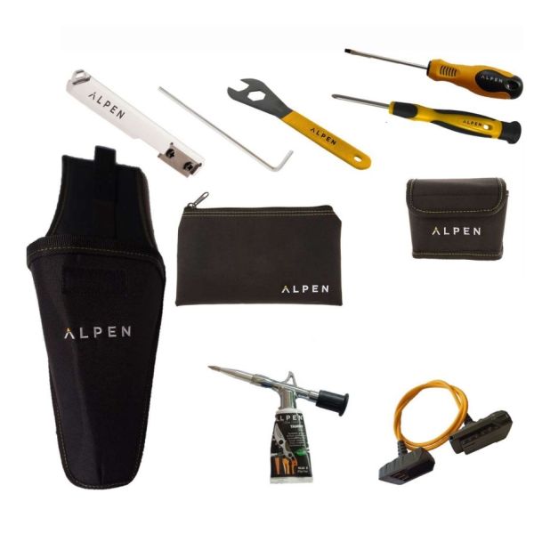 Livrée dans une mallette de transport avec un chargeur 3 voies et des outils nécessaires à son entretien quotidien (aiguiseur, tournevis, clés, pompe à graisse).