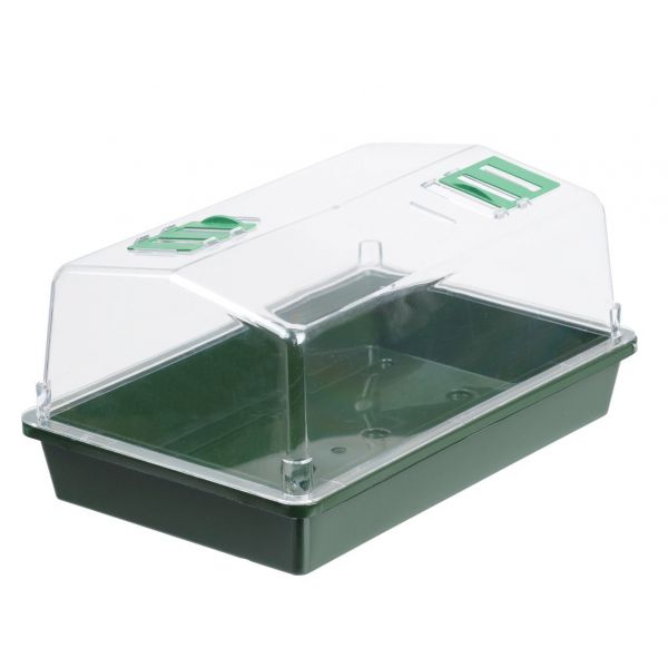Terrine rigide en plastique injecté, équipée d'un couvercle transparent, muni de deux aérateurs coulissants pour un réglage optimal du niveau d'humidité.