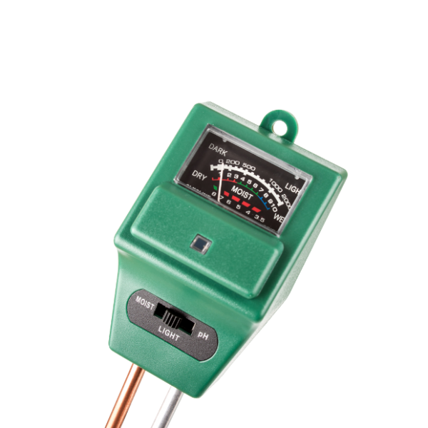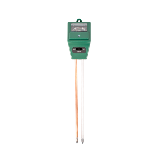 Instrument pour mesurer les taux d'acidité, de l'humidité et de l'ensoleillement : PH 3-8, humidité 0-10 % HR, ensoleillement 0-2000 lux. 295 x 50 mm, poids 68 g.