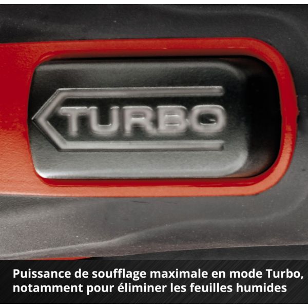 Pour les zones nécessitant un travail particulièrement intense, le souffleur de feuilles sans fil est équipé d’un mode turbo activant la puissance de soufflage maximale.