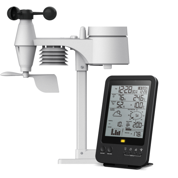 Le capteur sans fil 5 en 1 (collecteur de pluie, anémomètre, girouette, température et humidité) est entièrement assemblé et calibré pour une installation facile.