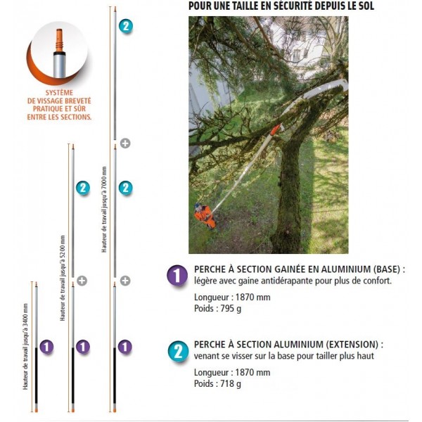 Hauteur de travail avec la perche base + 2 perches rallonge : jusque 7m00