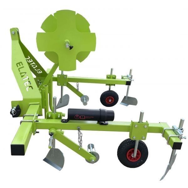 2 roues pneumatiques: réglage des fonctions (inclinaison et hauteur des versoirs et des roues) par écrous à boulons.